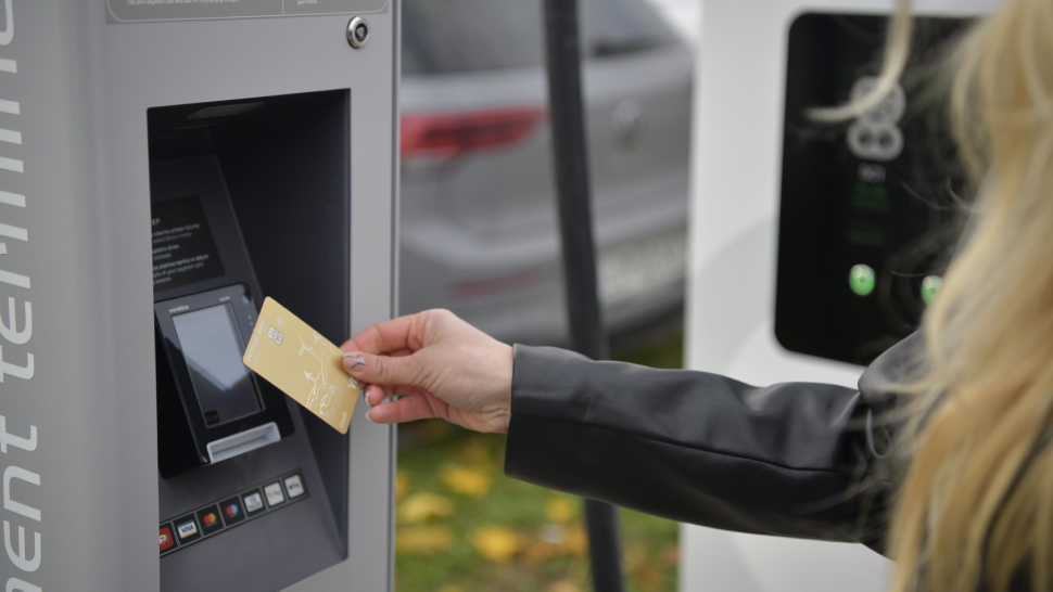 Na e-plačilnem terminalu ob polnilnici izberete znesek ali količino energije ter polnjenje začnete in zaključite s plačilno kartico. Tovrsto plačilo polnjenja ni možno na vseh polnilnicah.